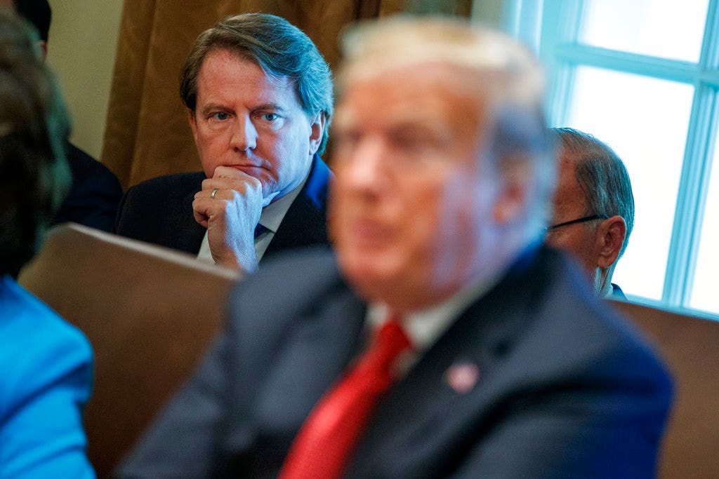 FILE: White House counsel Don McGahn looks on while President Donald Trump speaks during a cabinet meeting. Wednesday, Oct. 17, 2018, in Washington. (AP)
